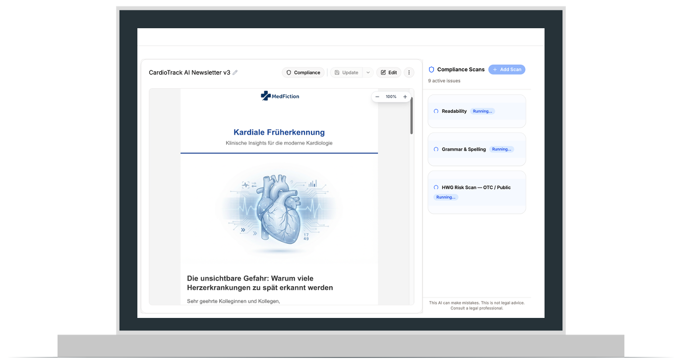 Unsere KI prüft Ihre Werbematerialien wie ein Medical- und Legal-Team – und setzt Verbesserungen auf Knopfdruck um.